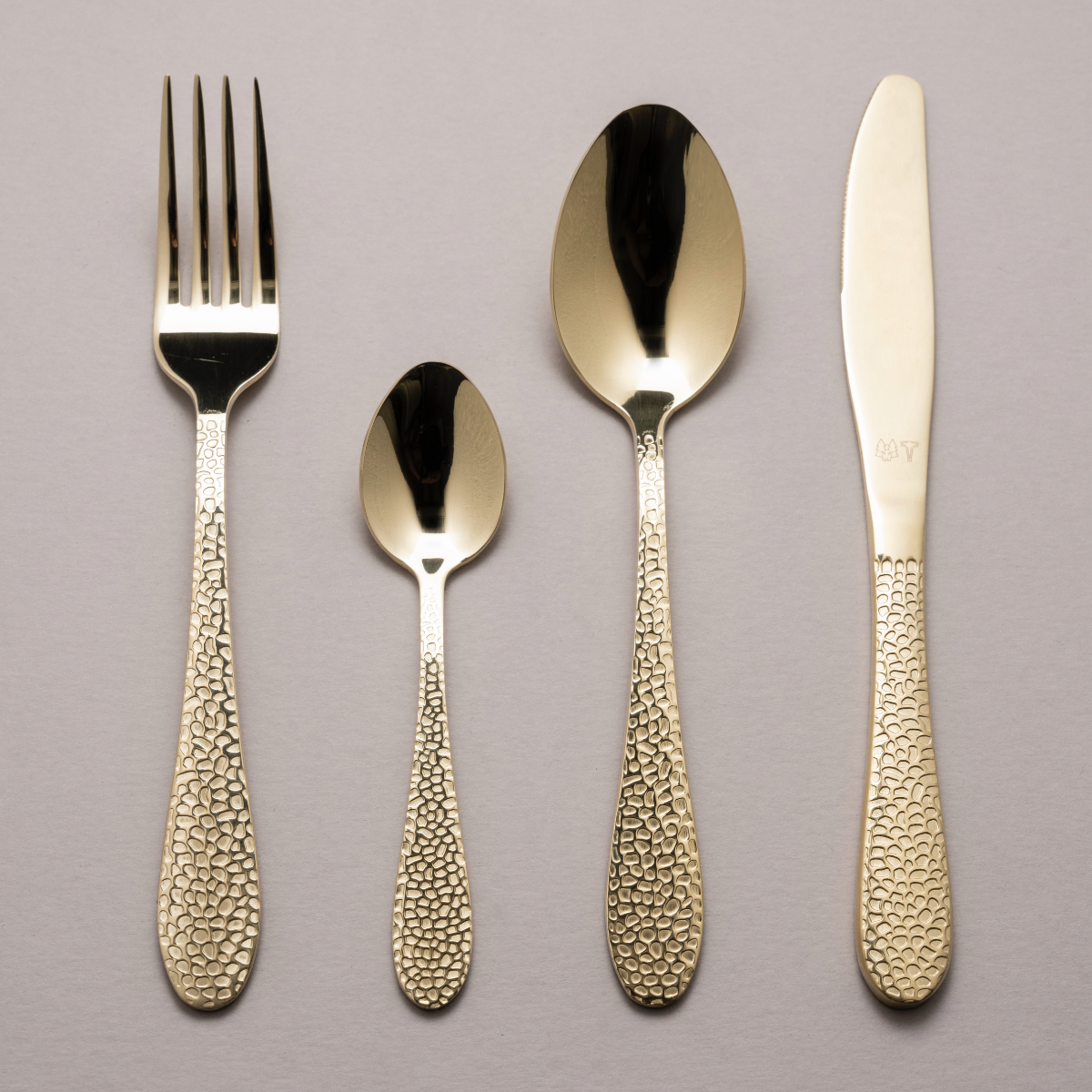 AURA är tillbaka. Vårt hamrade bestickset i ljus mässing som vi kallar för CAVA. AURA CAVA - helt enkelt.