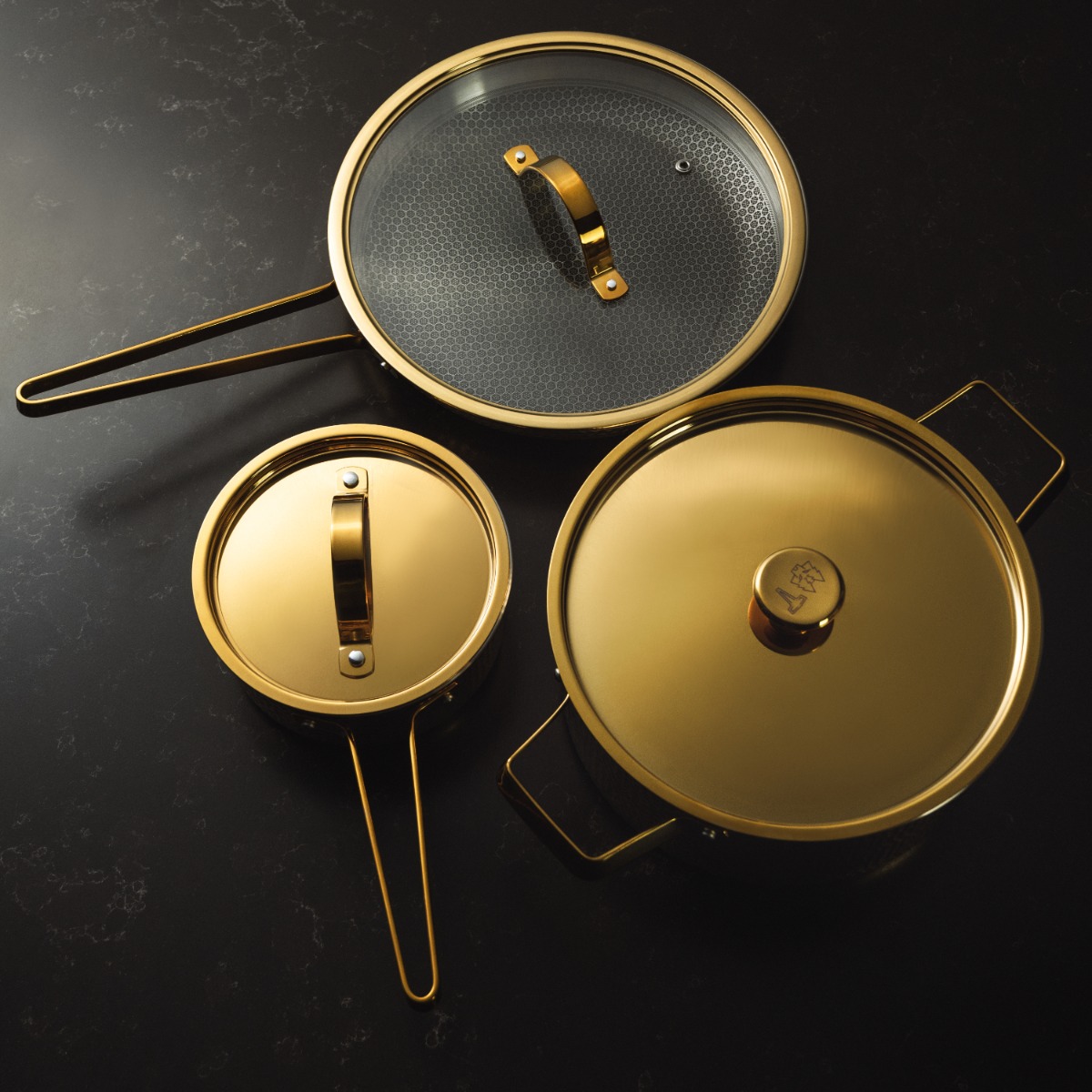 En välkommen återkomst. Set med kokkärl helt i mässinglackering. Ett unikt set av otrolig byggkvalitet i hållbara material och i Vargen & Thors ikoniska hamrade mönster på utsidan. Innehåller kastrullen ELIS, grytan MEYA samt stekpannan Modell Lb.