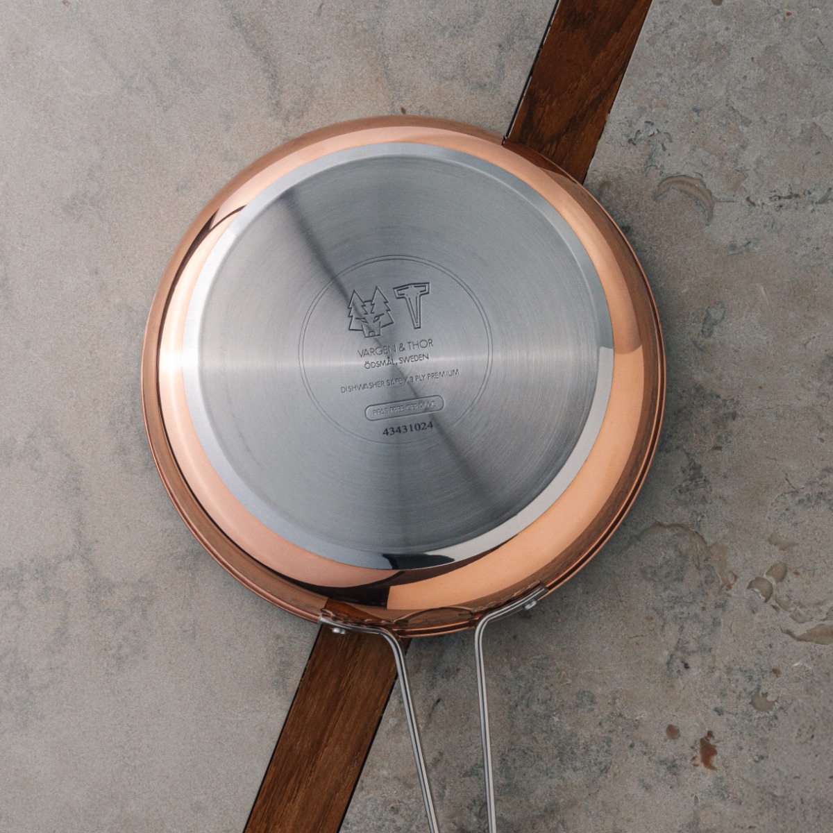 Unik bottenkapsel som gör stekpannan kompatibel med induktionshäll, trots yttre av äkta koppar.