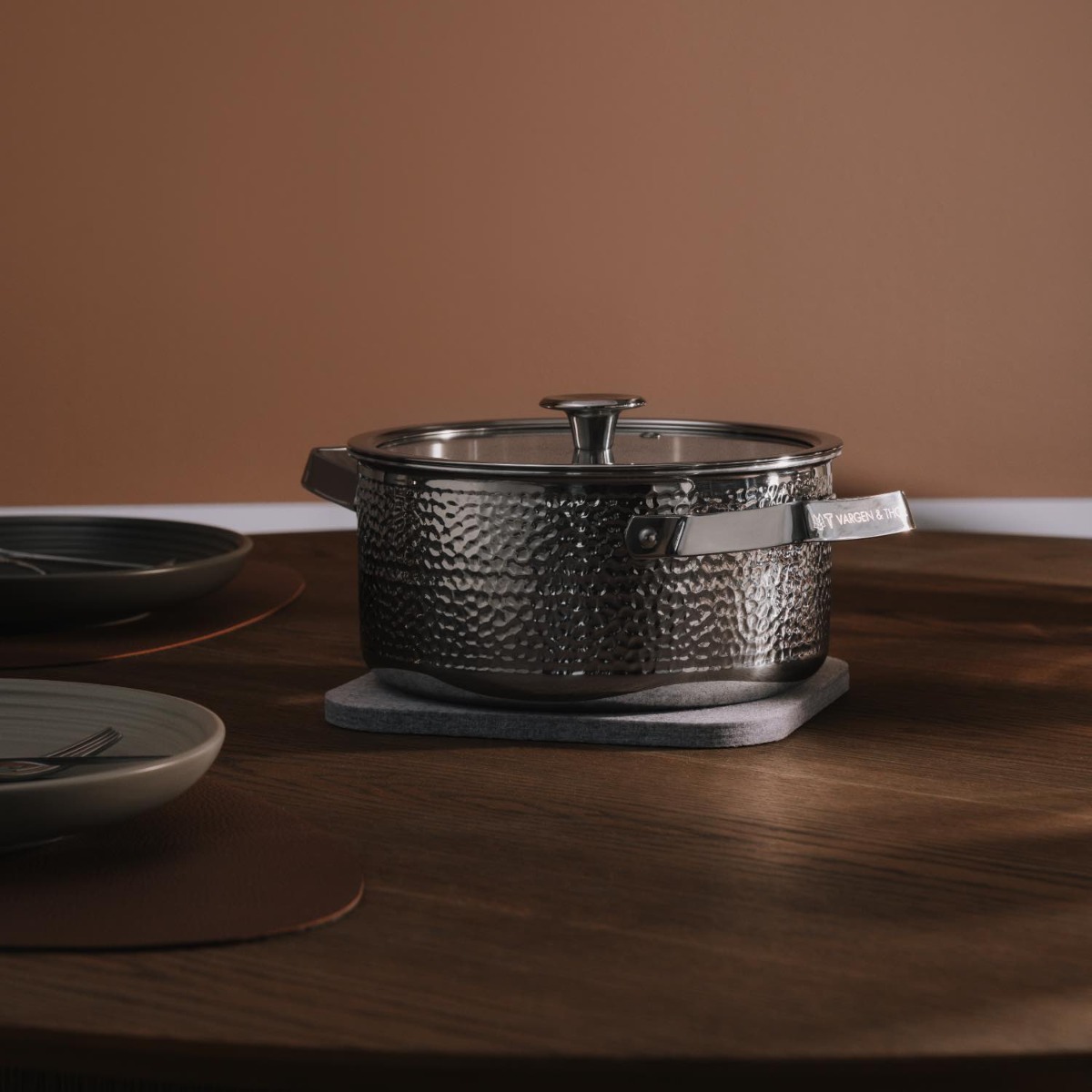 In polished, hammered steel, here comes BARK.2, which is a 2.8L pot in the KROMA series. An everyday hero who easily cooks rice, pasta or potatoes for a family of four. Why the runner-up in "BARK.2"? This is the upgraded model of BARK. Now with two ears instead of a long handle as requested by our customers. Details: Dishwasher safe, oven safe and works on all hints of hobs including induction. Built in 3 layers with aluminum core for fast and even heating. Heat-safe handles. Delivered in our new FROST box. Made from recycled materials. Width: 21 cm (32.5 cm with handle). Bottom capsule: 19 cm. Height: 10.5 cm (12.5 cm with knob) Name: BARK.2 / Species: VTBARK2 / EAN: 0759159828125