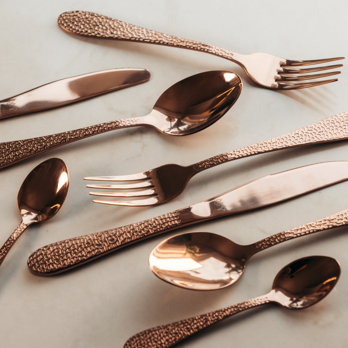 One set: 16 pieces (4 forks, 4 spoons, 4 knives, 4 teaspoons). Unique cutlery set. Fenix Copper Rosé is a hit. A meal is not just about the food on the plate. The mood is lifted by the right company in the room and the experience is enhanced with the right cutlery in hand. These cutlery are sturdy and have good weight as well as a nice balance we have worked for a long time to achieve. Details. Hammered surface front and back. Dishwasher safe