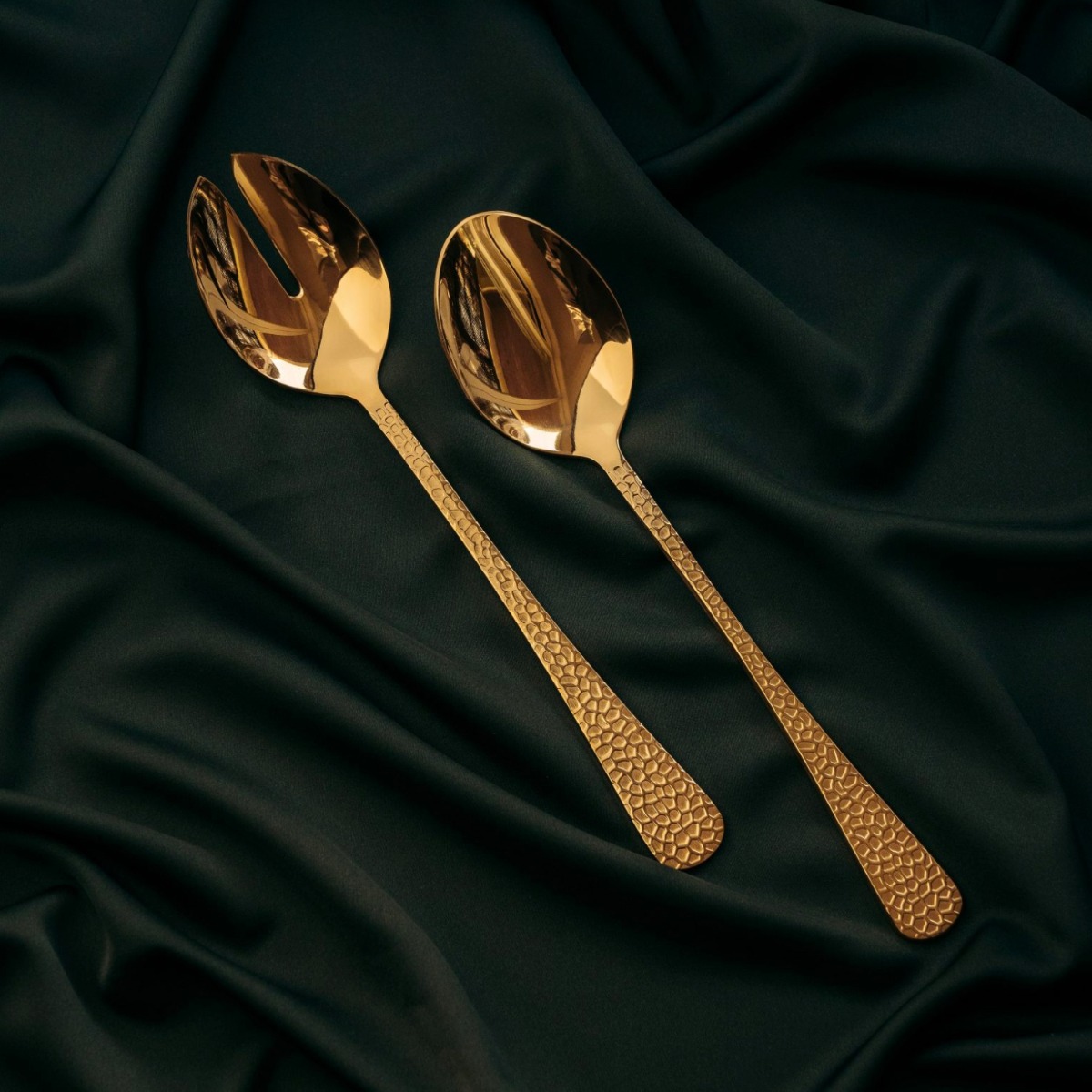 The shade in collaboration with the hammered design is a pure shimmer of elegance. This salad cutlery is a perfect complement and new addition to the NIMBUS series. Made of hammered stainless steel. A lovely brass lacquer. Sturdy and dishwasher safe. Delivered in sets of 2. Height: 25.8cm. Thickness: 3.5mm. Hammered, consistent design on both sides. Made of stainless, polished steel of type 18/10. A pure feast for the eyes and a real pleasure to use. 5 year warranty.