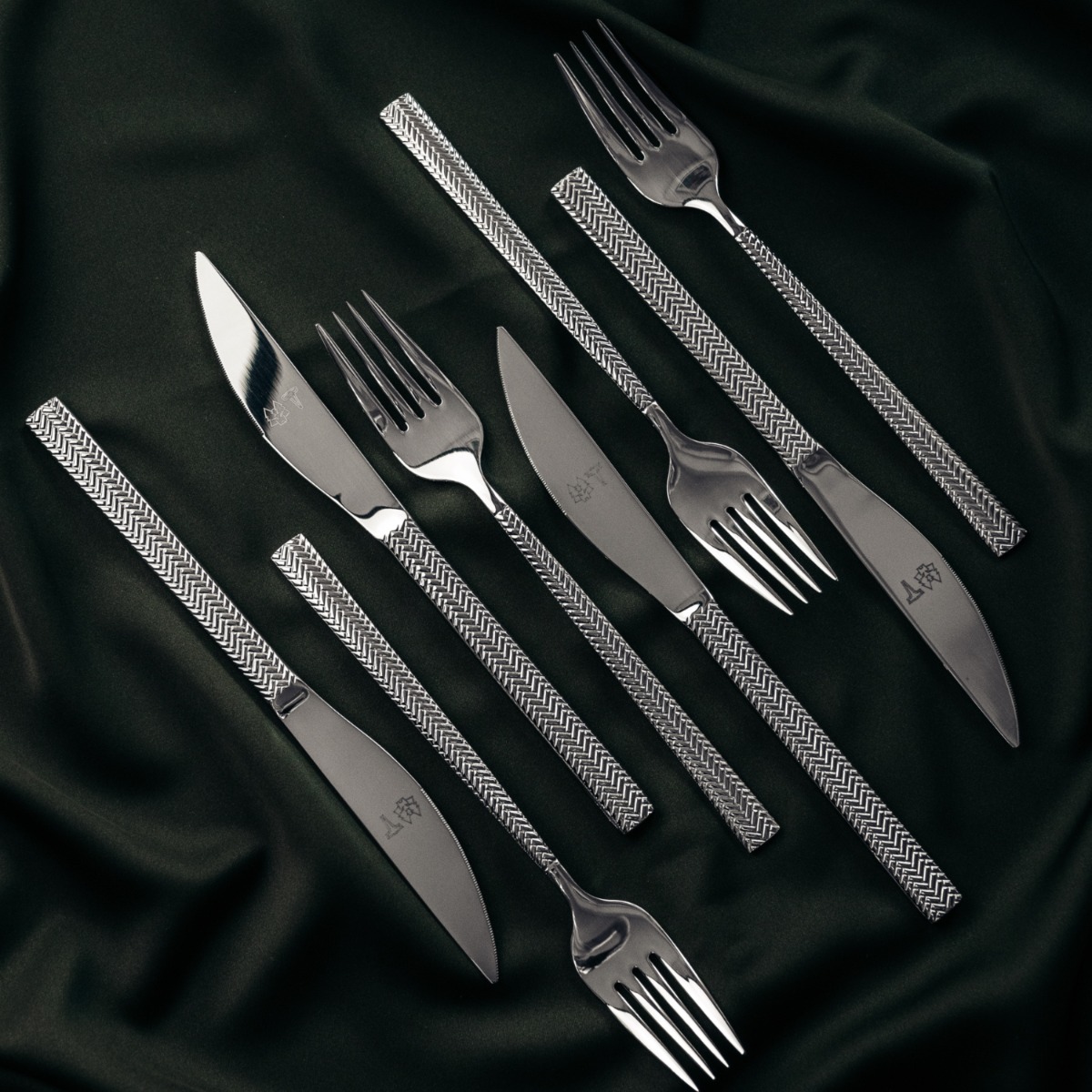 This is GLOW. Our barbecue cutlery. Comes in a set of 8 pieces (4 forks and 4 razor-sharp knives). Created for lovely barbecue evenings but of course works just as well for everyday use, everything you cut is easy as a dance. Made of high-quality steel, from Italy. When we were going to develop these barbecue cutlery, we wanted to focus on 3 things that we think other barbecue cutlery has missed. 1. A razor-sharp knife that should fit comfortably in the hand. The primary thing in a knife, especially when it comes to barbecue cutlery. 2. Four-tooth fork, not three-tooth. 3. No wooden handles. These grill cutlery are 100% dishwasher safe and also work well in industrial-grade dishwashers. Something that is not possible with wooden handles. That simple. That simple. We have checked all our own and our customers' wishes. We have also managed to do so with a shimmering, unique design on the cutlery with a herringbone pattern. All this in a box that is stylish and perfect to give away as a gift. To others or to yourself. Optionally.