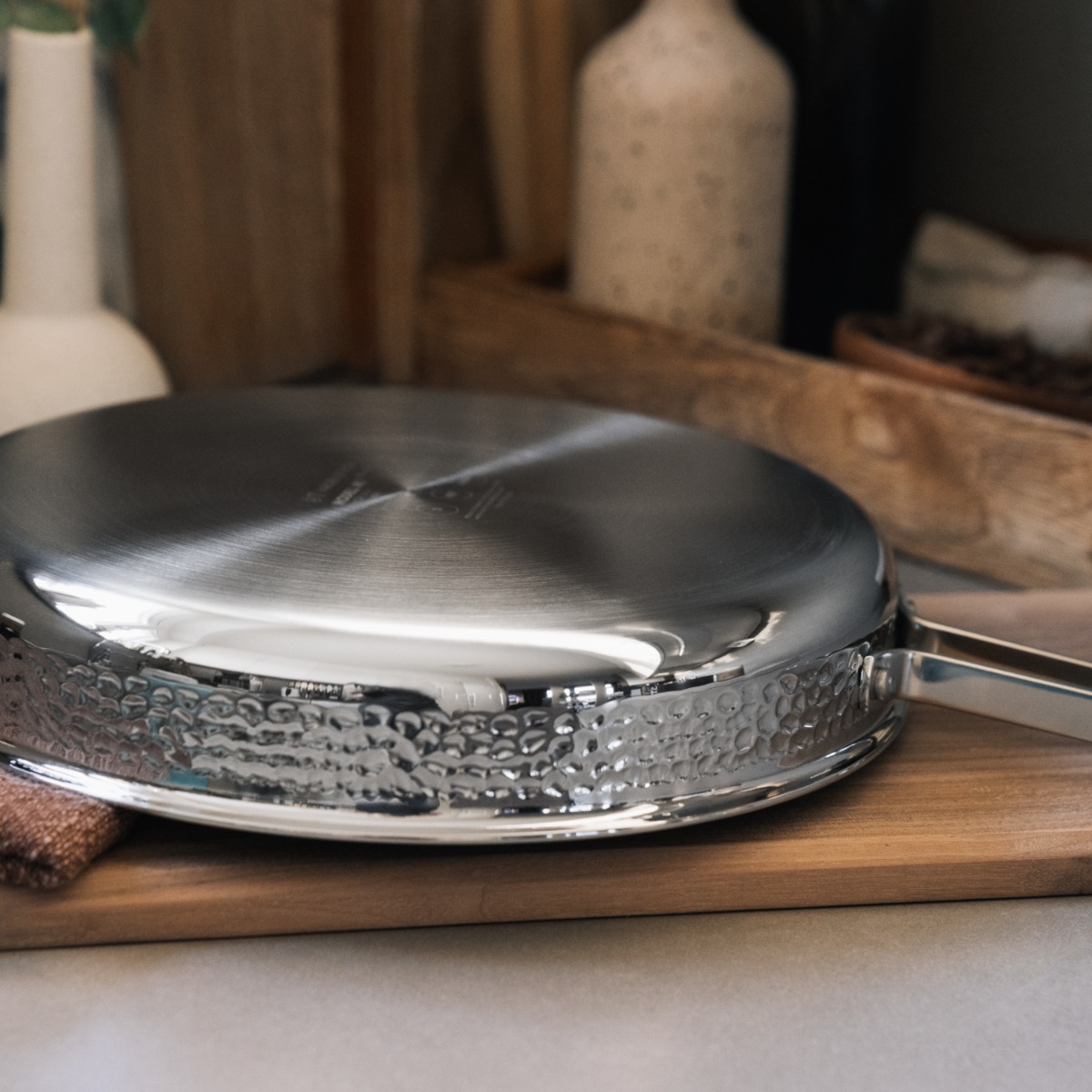 CROMO LIMITED – A new world clad in steel. From Italy. The model, which we have chosen to call, MODEL M1 is a sauté pan of 28cm from Vargen & Thor. Delivered completely without coating. Model M1 has a unique hammered surface with matching steel handles. Made entirely of durable stainless steel for long, long, long life.