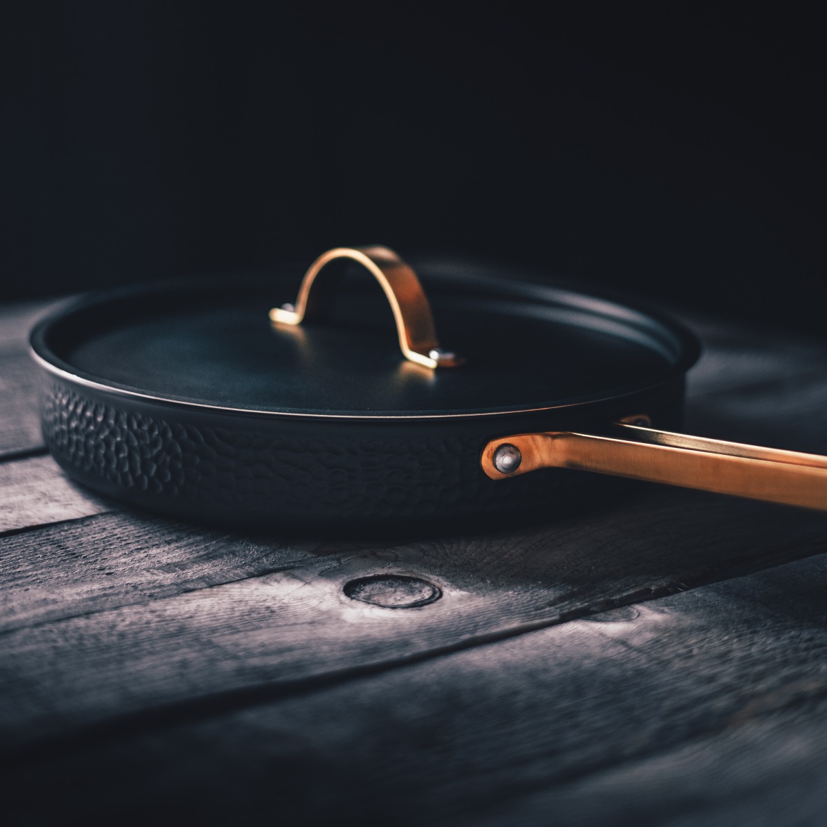 A hybrid between sauté and frying pan. It was advanced for us to make it easy for you. This is Model X, matte black 28cm pan with brass details. A flagship.