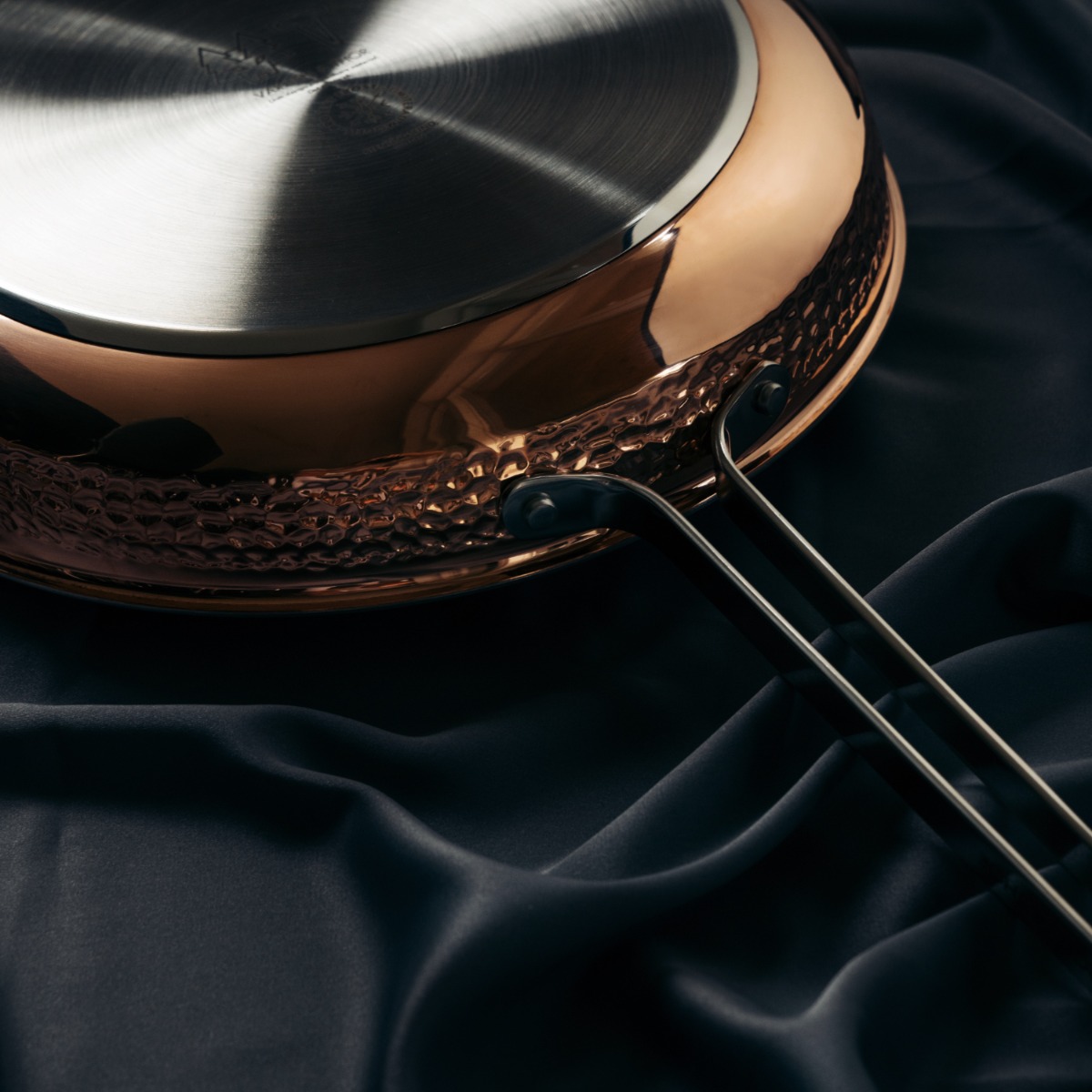 Observera att detta är en stekpanna där utsidan är tillverkad helt i äkta koppar. Ett fantastiskt material när det kommer till värmespridning och snabb uppvärmning – men den kräver underhåll för att bevara ursprunglig glans då materialet oxiderar naturligt. Många gillar hur kopparmaterialet utvecklar sig med fläckar och färgskiftningar – detta är en naturlig reaktion – men vill du att pannan ska se ut som den dagen du tog upp den ur kartongen så rekommenderar vi att använda kopparputs emellanåt. Eller vårt bästa husmorsknep: smörj med en saltad citronhalva så ska du få känna dig som fysiker för en stund.