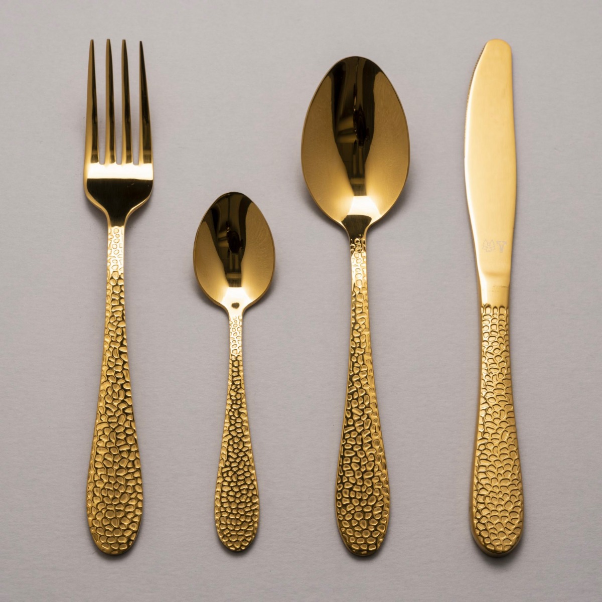 Our icon. Nimbus in shimmering beautiful brass tone and hammered handles. Front and back. When you see the unique hammered surface, you know it's the Wolf & Thor. With a true dream from the west coast of Sweden to a unique product on your table. One set: 16 pieces (4 forks, 4 spoons, 4 knives, 4 teaspoons).