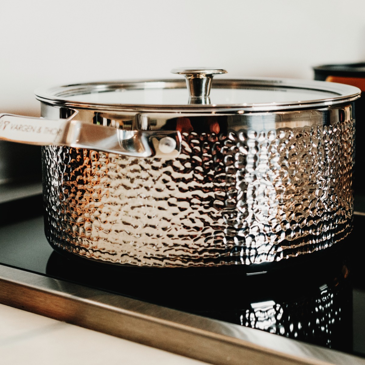 PIXEL is a pot measured to 4 L from us, Vargen & Thor, in a unique hammered surface in shimmering stainless steel. A perfectly large pot that is stylishly matched with the other models in the KROMA series. Detail: Works on all hobs, including gas and induction 24 cm diameter 4 L volume Heat-safe handles 2.5 mm aluminum Dishwasher safe 304 stainless steel lid (included) 201 stainless steel handle It's in the details. Stainless, polished steel together with an aluminum core creates a fast and perfect heat dissipation. Exterior in our iconic vibrant pattern. Glass lid with Vargen&Thor engraved logo