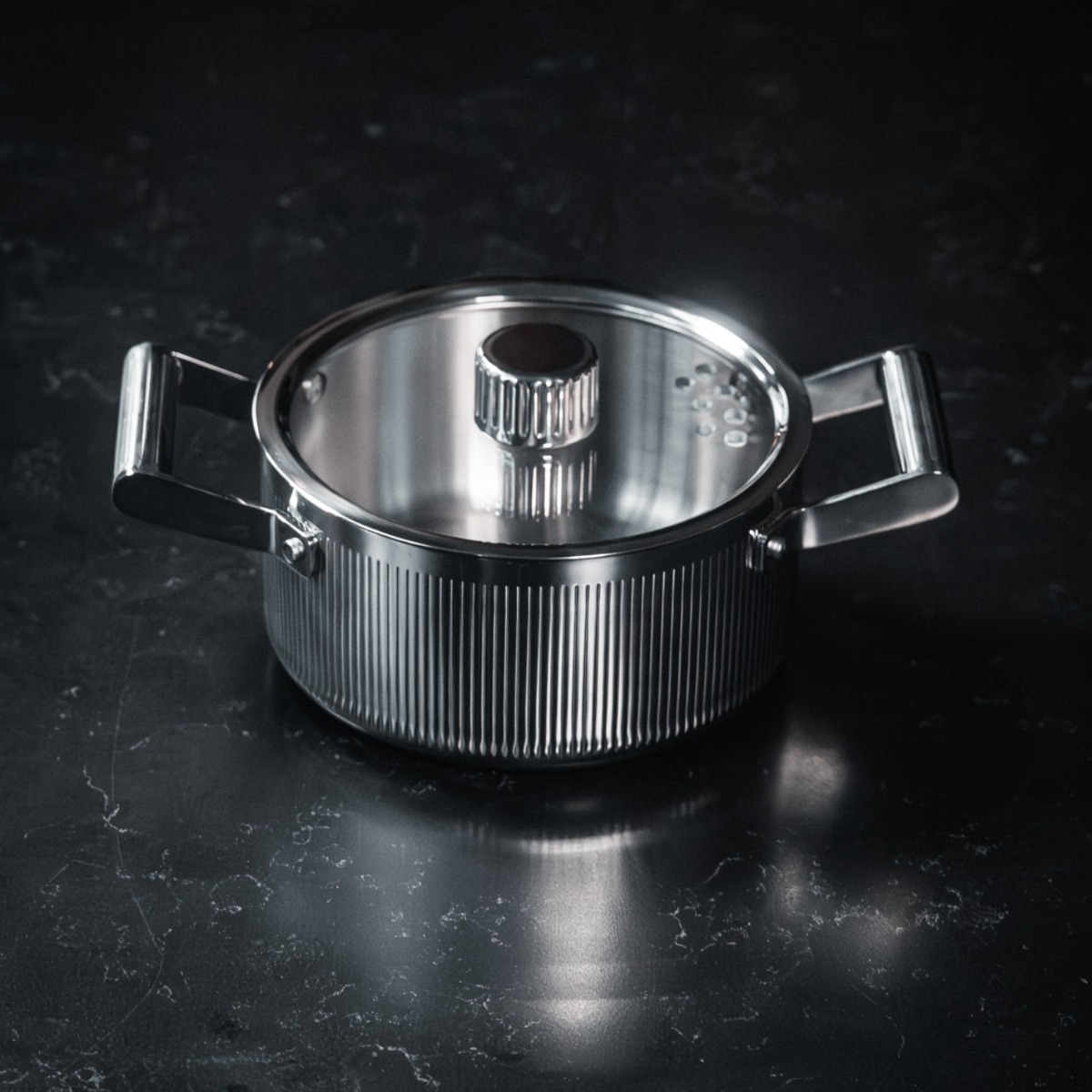 GLIMA 2 L är en hyllning till det lilla formatet som gör det stora möjligt. Utvecklad under fyra års tid och byggd i fem lager av rostfritt stål (samt aluminiumkärna för optimal värmespridning) – för en känsla av stabilitet och precision som du märker redan när du lyfter den. Den karaktäristiska räfflade utsidan i polerat stål fångar ljuset och ger varje användning en nästan ceremoniell känsla. Man vet att det är GLIMA. Den andas vårt DNA.