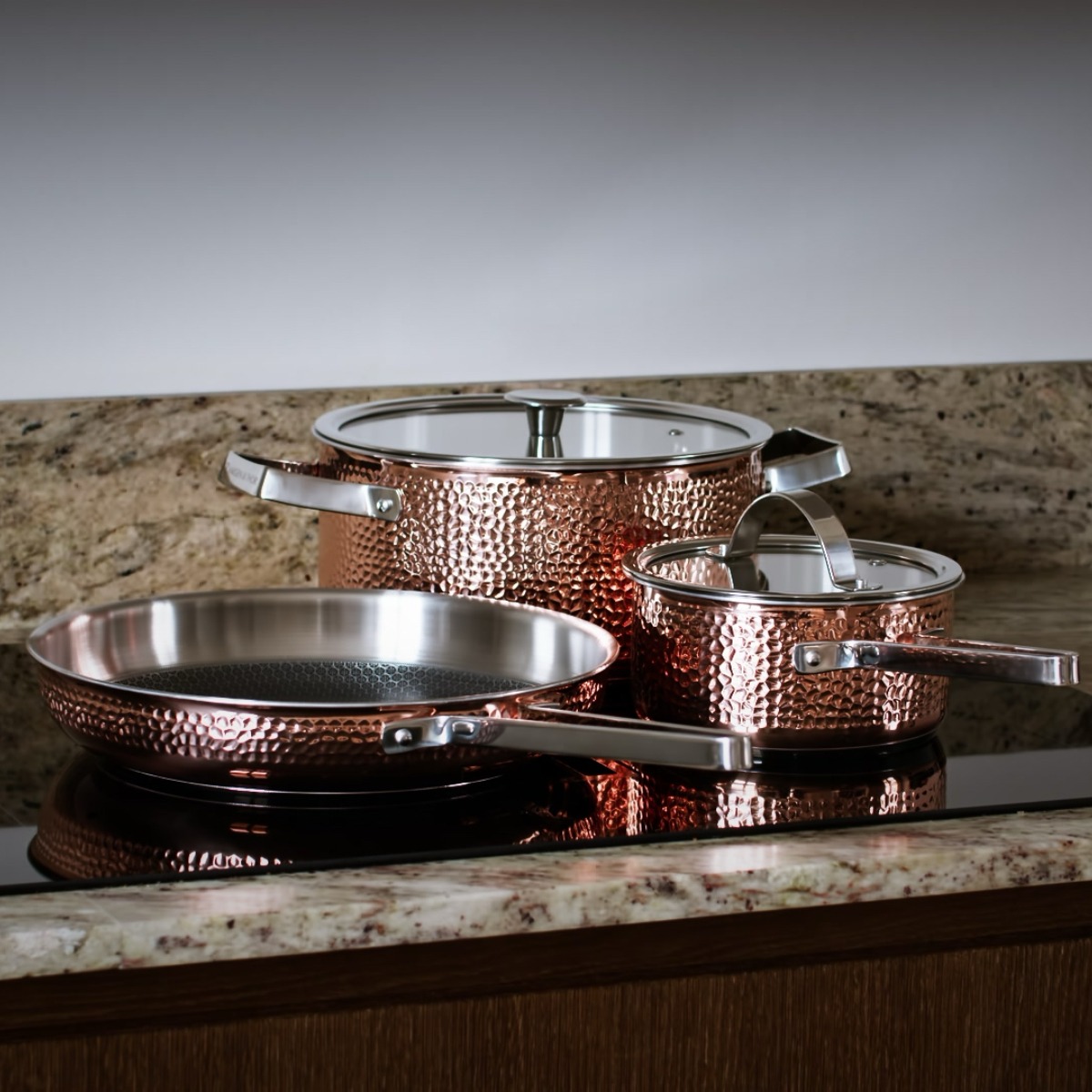 Unikt, välskapt och i hållbara material. Diskmaskinssäkert set i vacker äkta, polerad koppar.