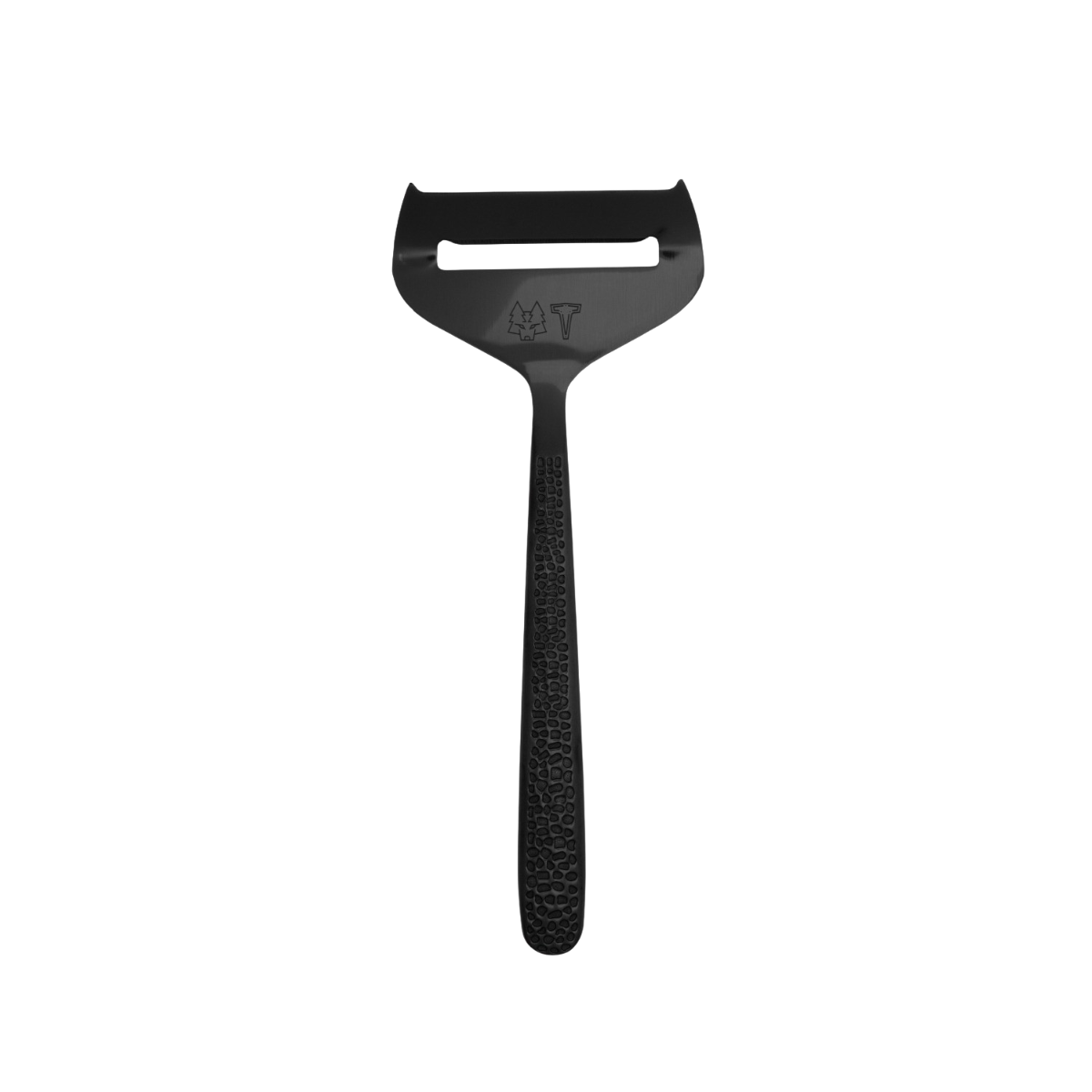 Vår egna osthyvel – helt i stål. Svart hamrat handtag fram och bak. Det är fint.