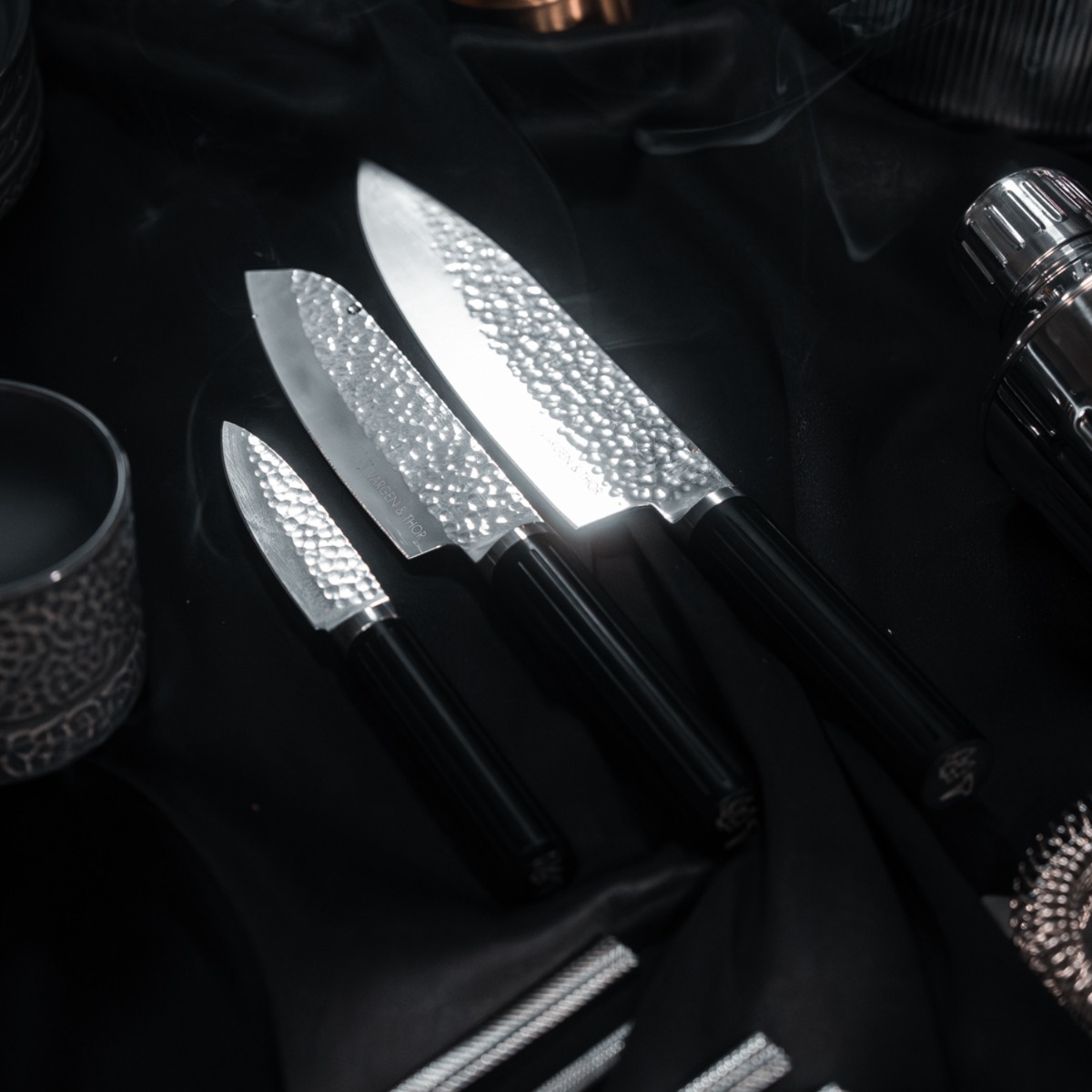 Sylvasst blad, tillverkat av svenskt stål. En välbalanserad, robust kniv helt i stål. Med vår nya Halo Handle och hamrade mönster - Levereras i snygg giftbox.